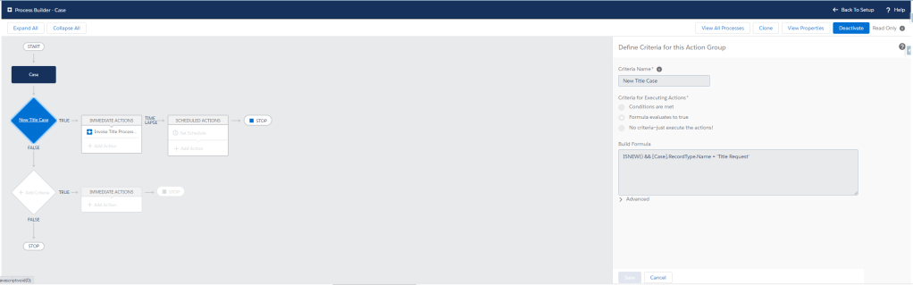 Note that in my case I am checking only that the case ISNEW() and it is of the type “Title Request.” Make sure your process-builder criteria is always hyper-specific and will only kick off when the intended changes are made to the record.