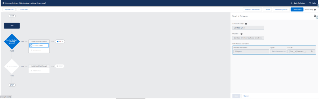 I’m glad you asked… now we will activate this process builder and create another invokable process builder on the Title custom object, which relates to contact…